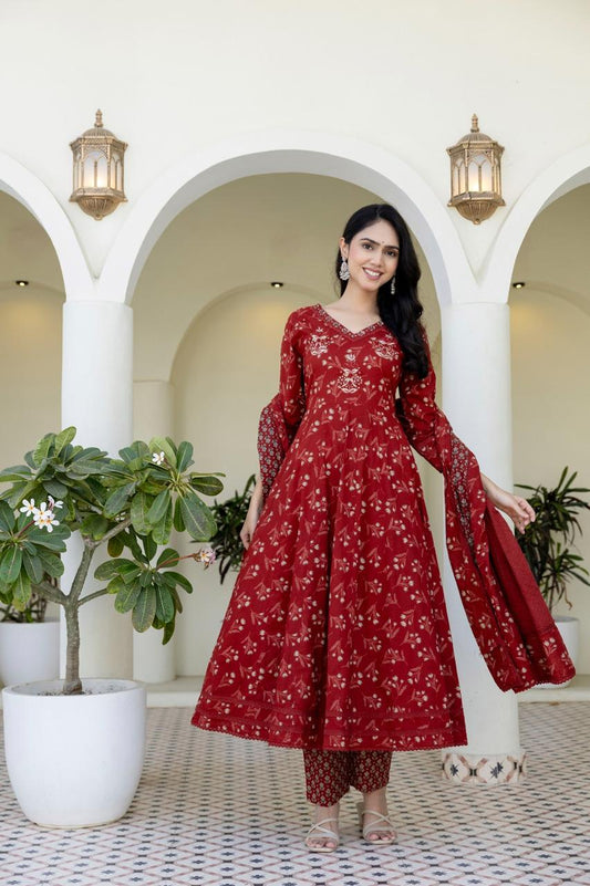 A-Line Cotton Kurta Set with Floral Embroidery