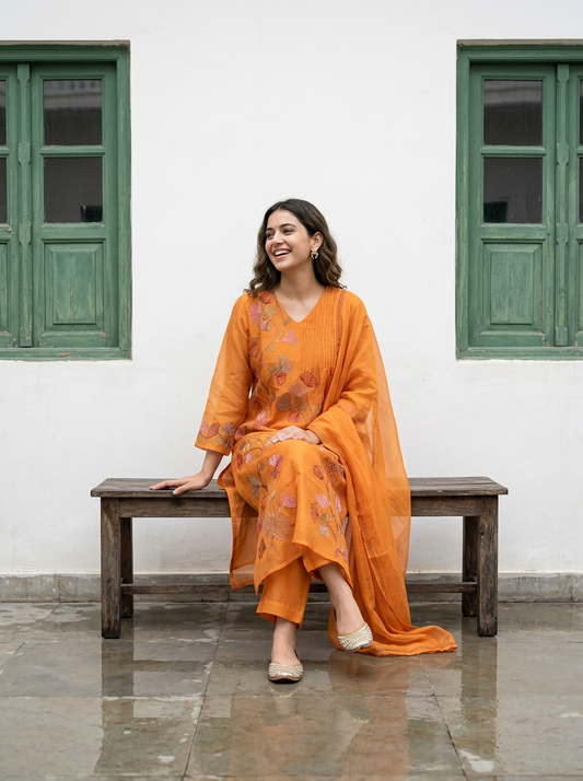 A-Line Mul Chanderi Kurta Set with Floral Embroidery