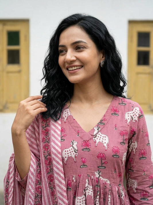 Cotton Pichwai Block Printed Anarkali Kurta with Cotton Dupatta.