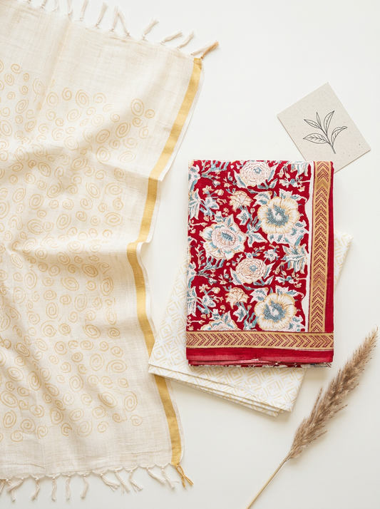 Cotton Block Printed Chiffon Dupatta Unstitched Suit Set