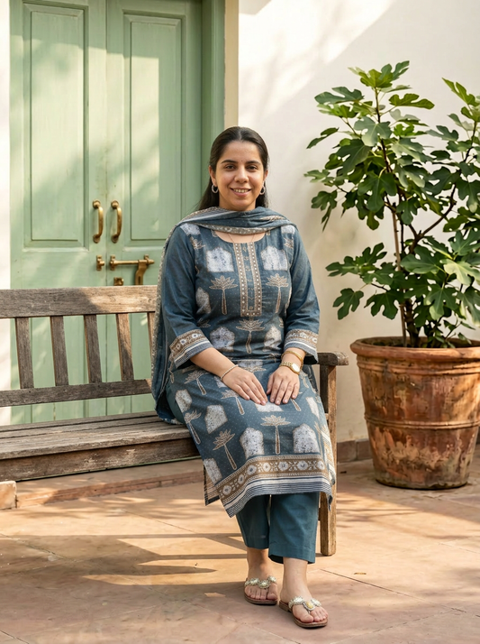 Cotton Linen Printed Kurta Set with Dupatta