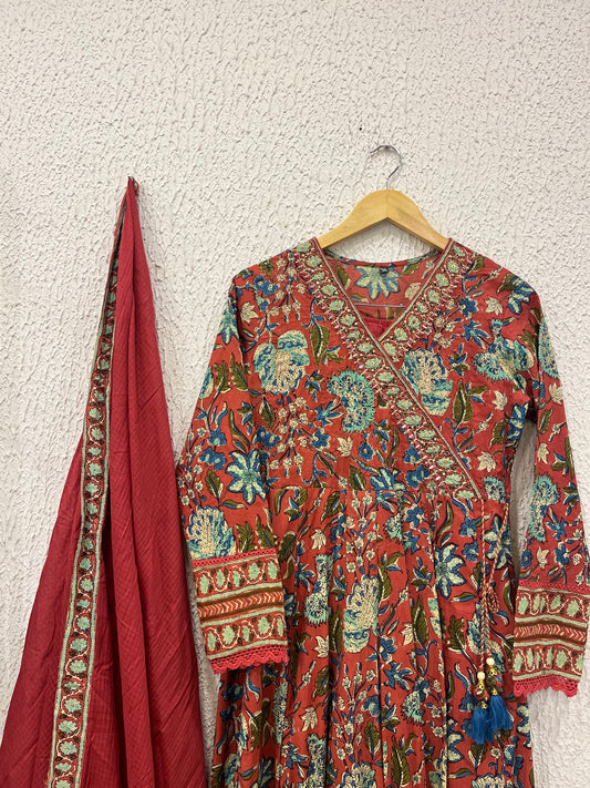 Angrakha Pattern Cotton Anarkali with Kota Doriya Dupatta