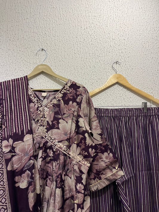 Purple Muslin Suit Set With Cotton Dupatta