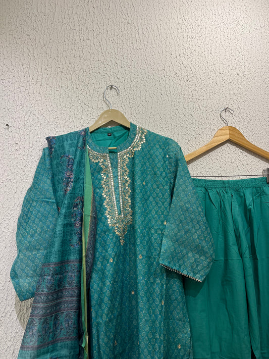 Teal Blue Printed Silk Kurta Set With Printed Dupatta
