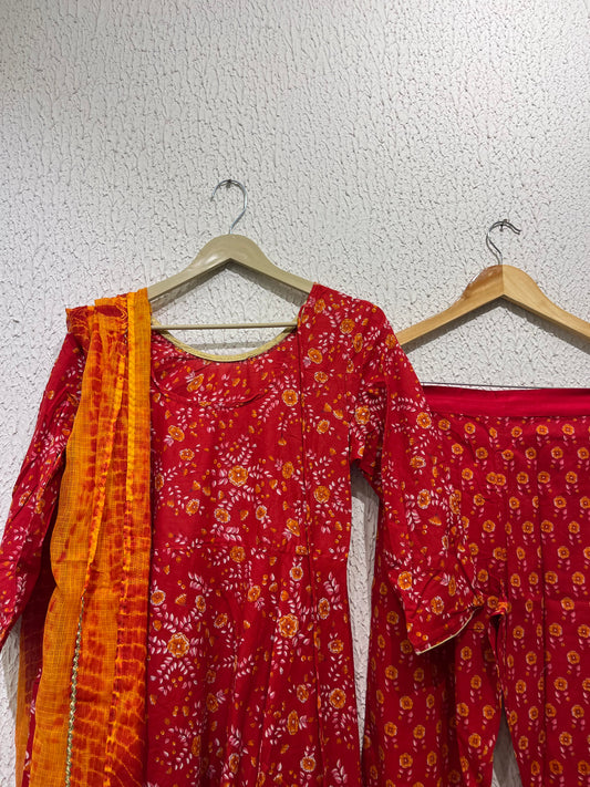 Red Printed Cotton Anarkali Suit Set With Kota Doriya Dupatta