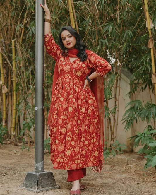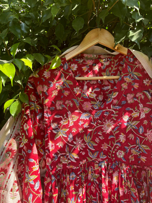 Red Floral Block Printed Anarkali Suit Set