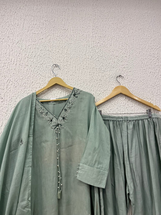 Sea Green Mul Cotton Suit Set with hand katha work