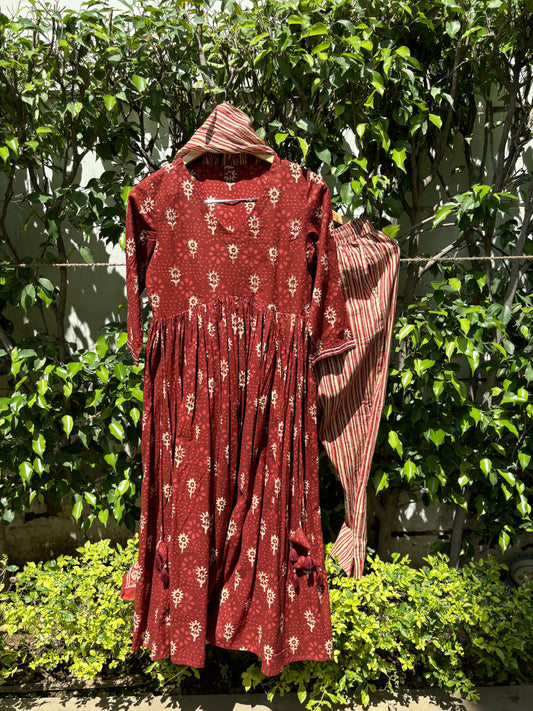 Red Dabu Cotton Anarkali Suit Set