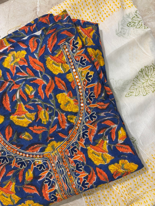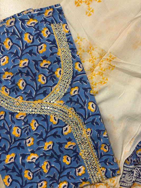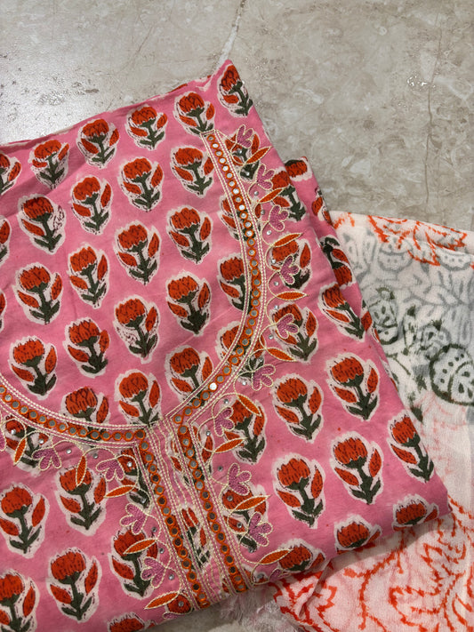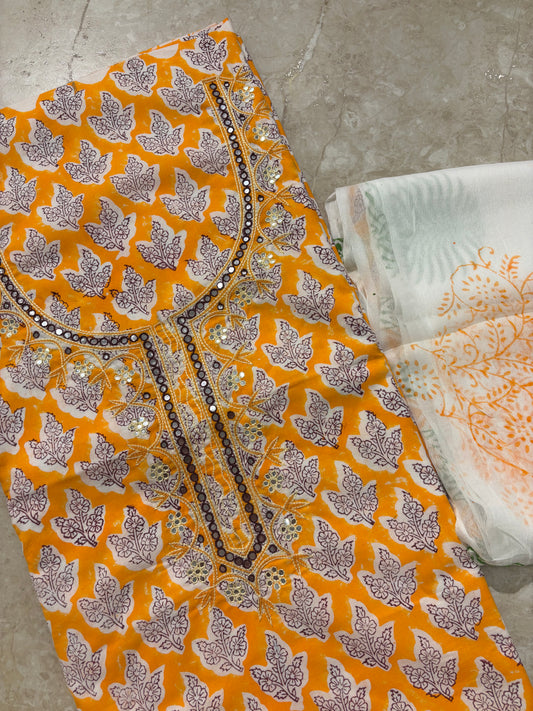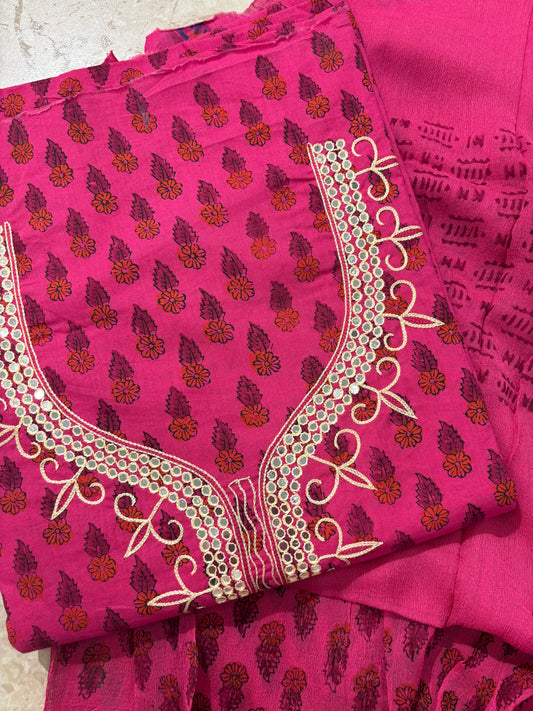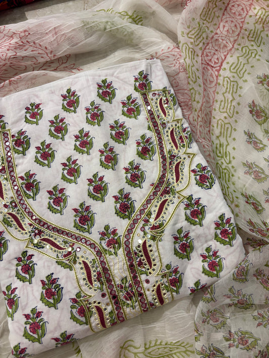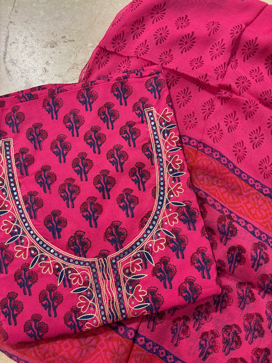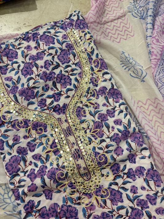 Thread Embroidered Cotton Block Printed Unstitched Suit Set