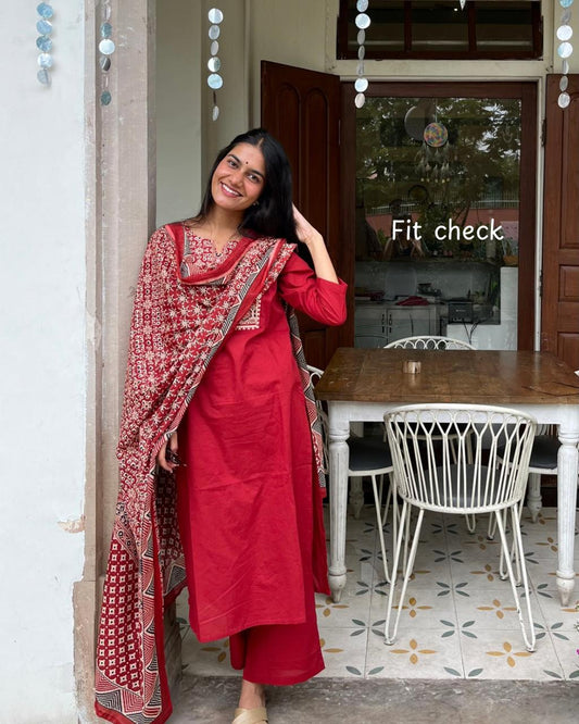 Red Cotton Suit Set with Ajrak Printed Dupatta