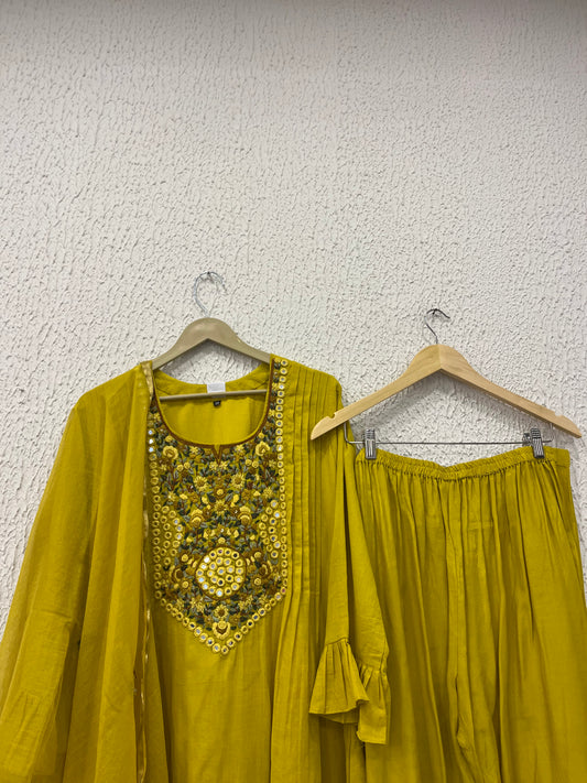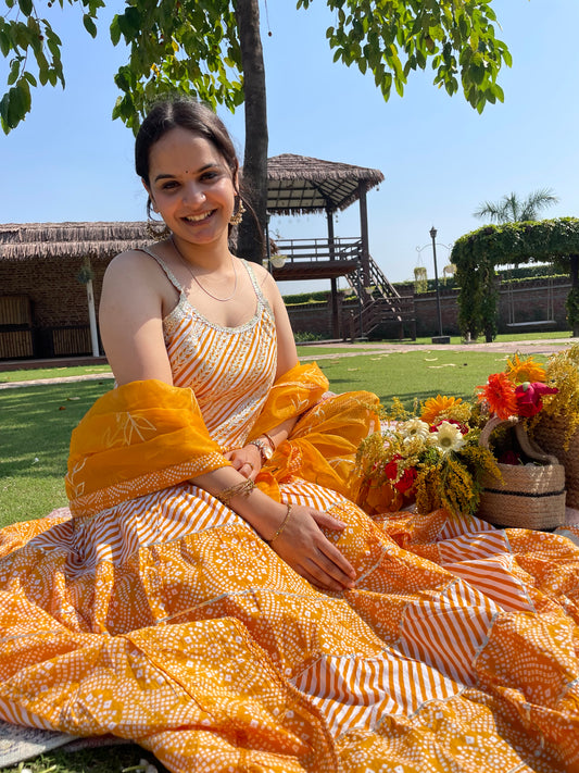 Yellow Gotta work Cotton Anarkali Suit Set with Organza Dupatta