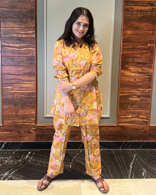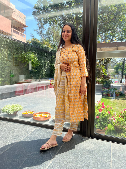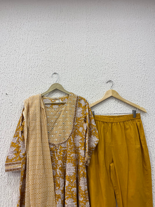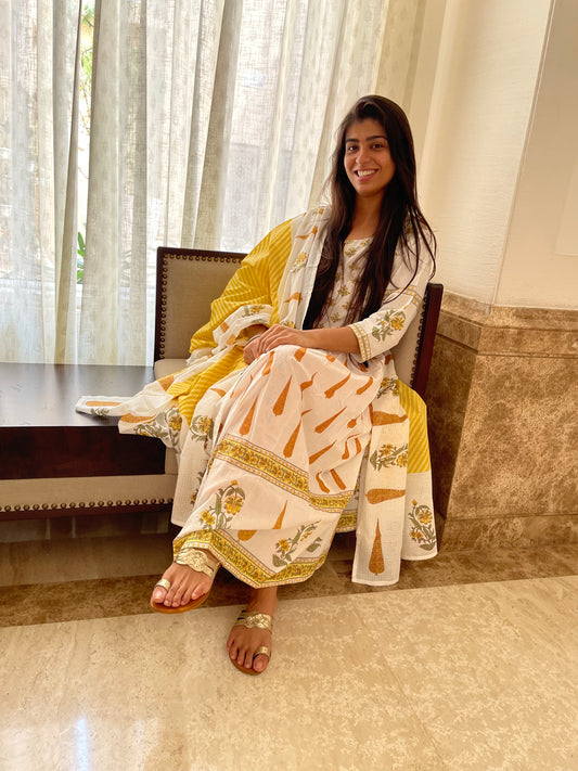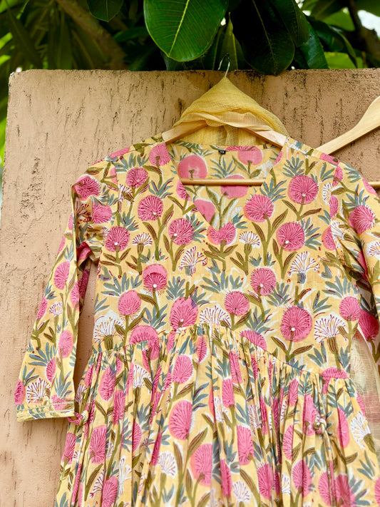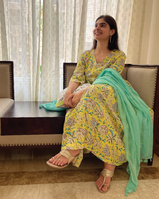 Yellow Floral Print Pure Hand-block Anarkali Suit Set