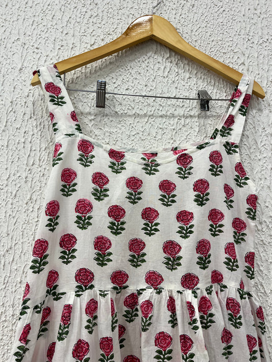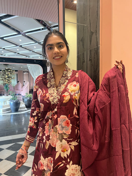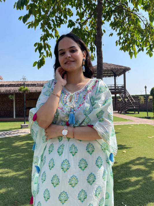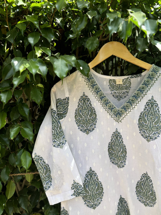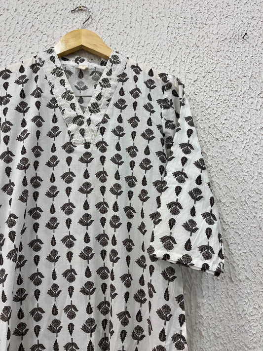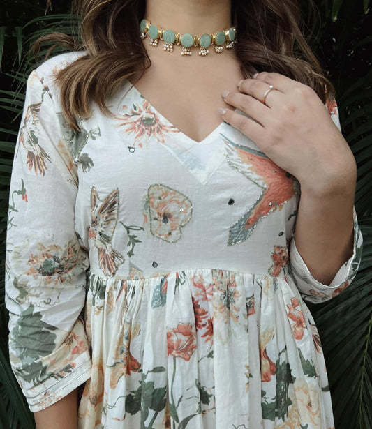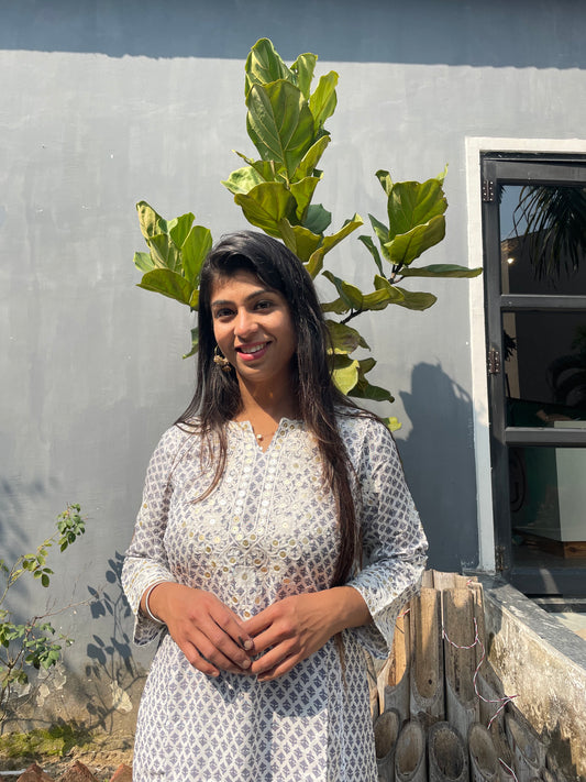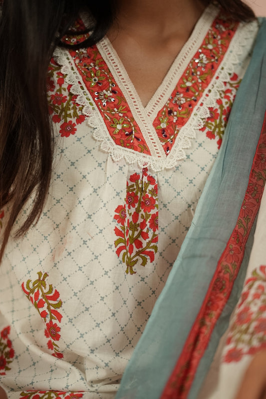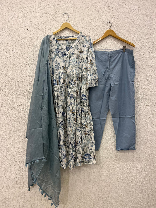 White/grey Printed Cotton Anarkali Suit Set with Kota doriya dupatta