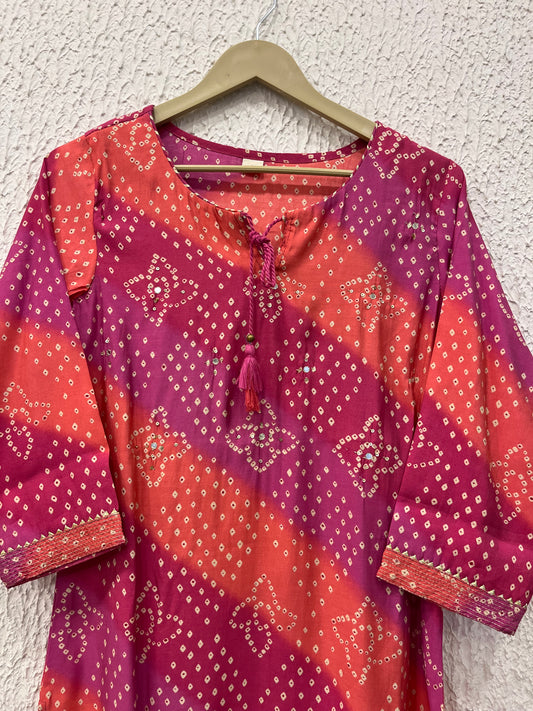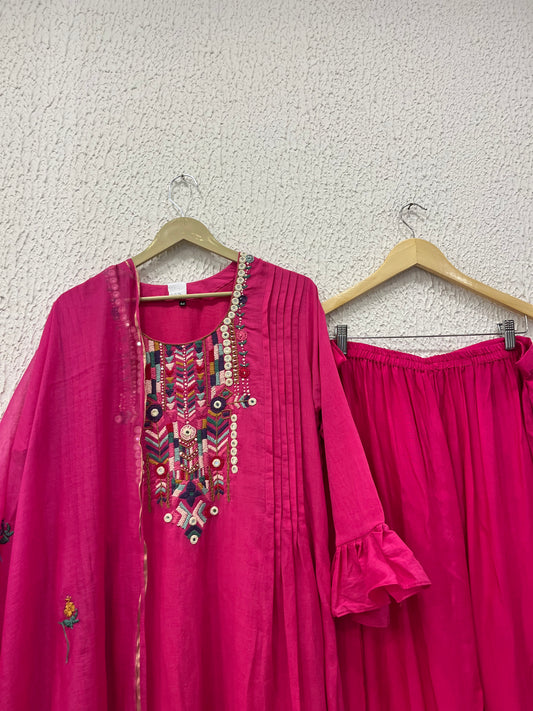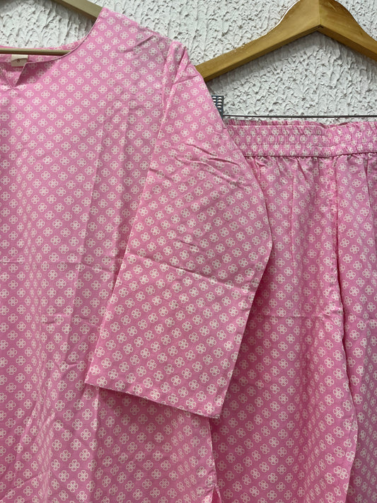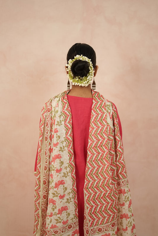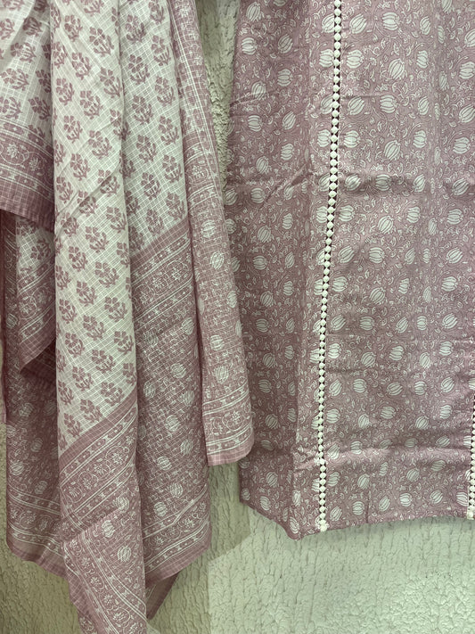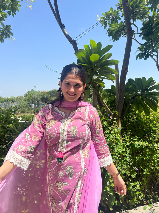 Pink Cotton Printed Dupatta Set with Lace detailing.