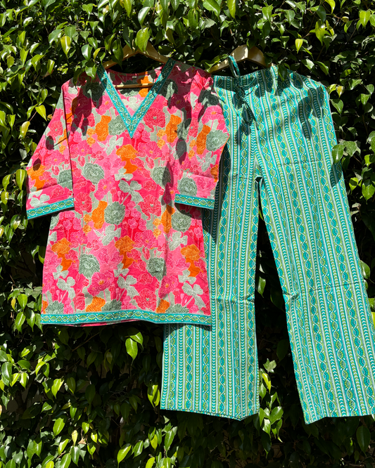 Pink Floral Printed V-neck Cotton Straight Suit Set