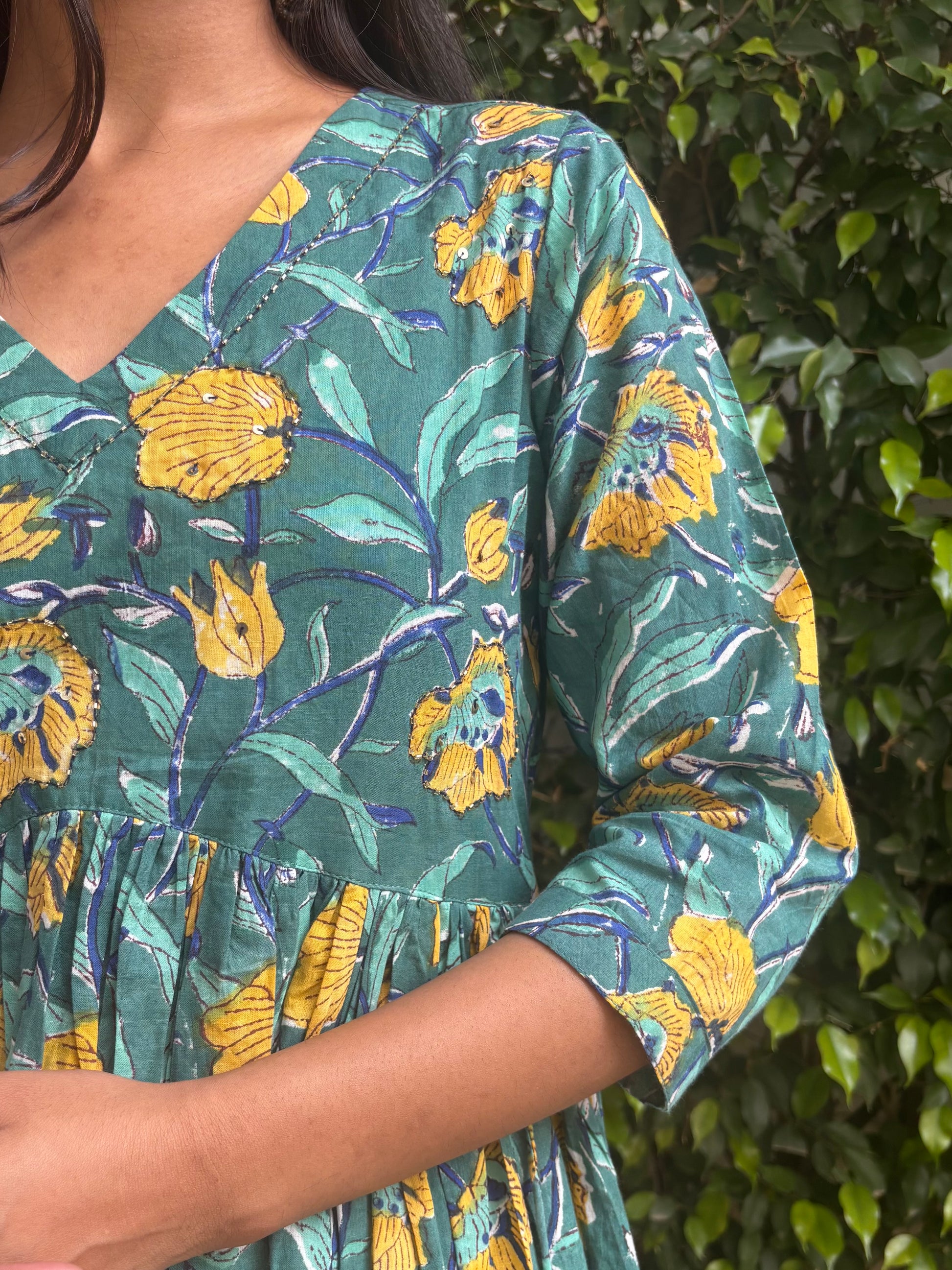 Green floral handblock printed cotton alia cut anarkali kurta with sequence details on the yoke.