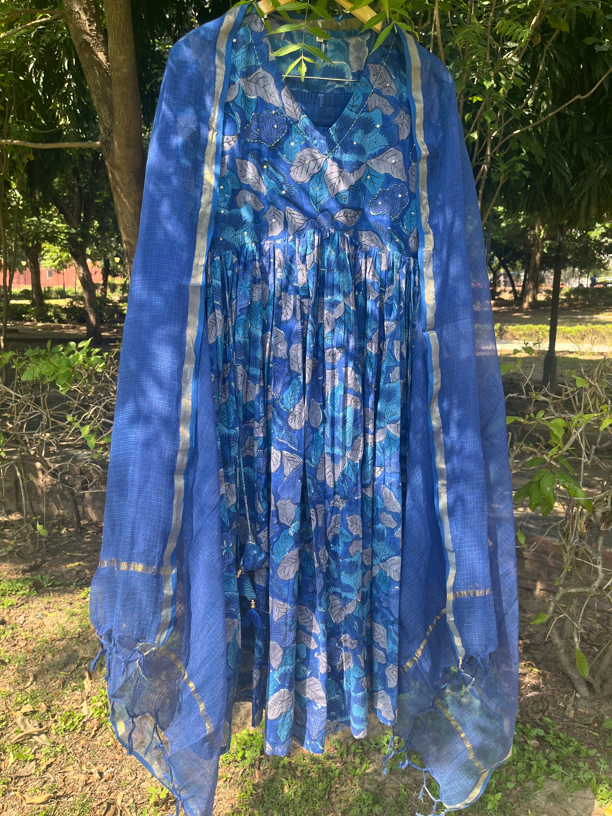 Blue floral handblock printed cotton alia cut anarkali kurta with sequence details on the yoke.