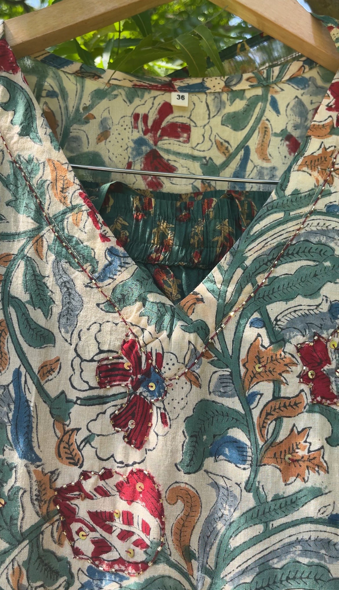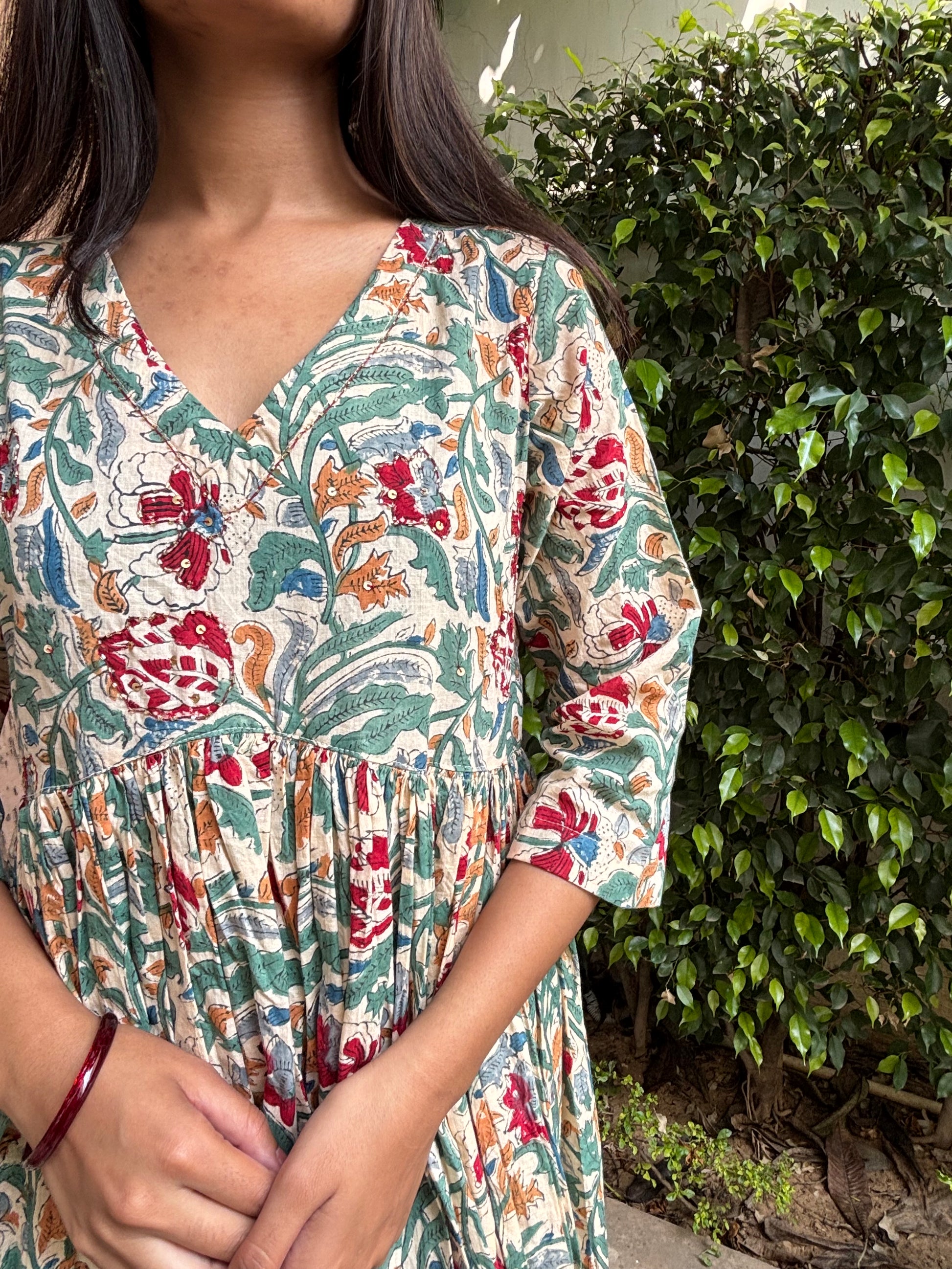 Green floral handblock printed cotton alia cut anarkali kurta with sequence details on the yoke.
