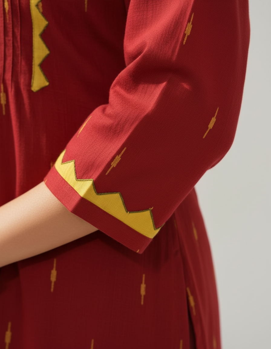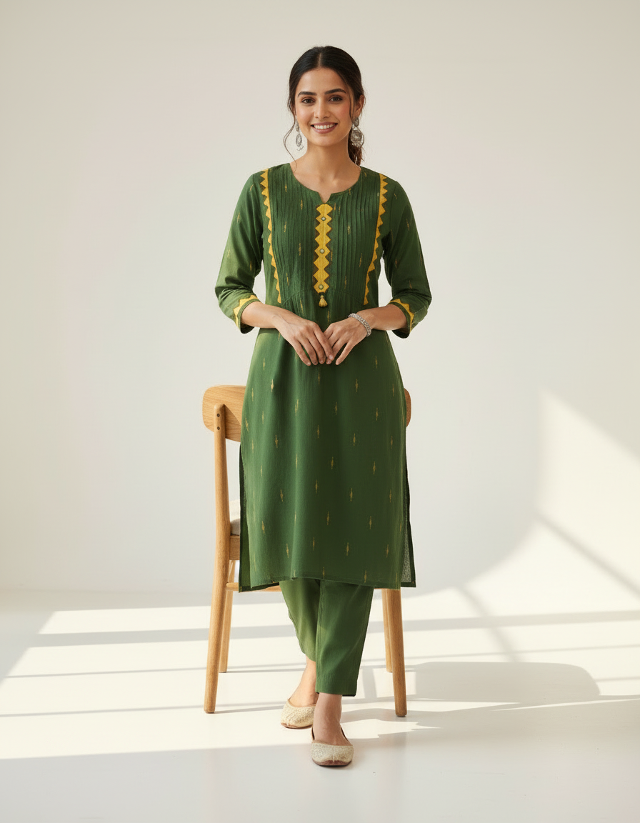 Paired with a coordinated straight cotton pant, this breathable set is ideal for daily wear, workwear, or casual outings, blending comfort with timeless Indian aesthetics.