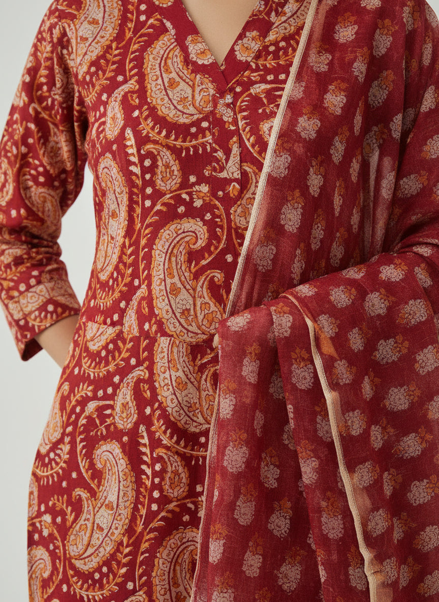 It is paired with matching cotton pants and a lightweight Kota Doriya dupatta, beautifully printed to complement the kurta. The airy texture and vibrant hues make this ensemble ideal for work, day outings, or effortless everyday wear.